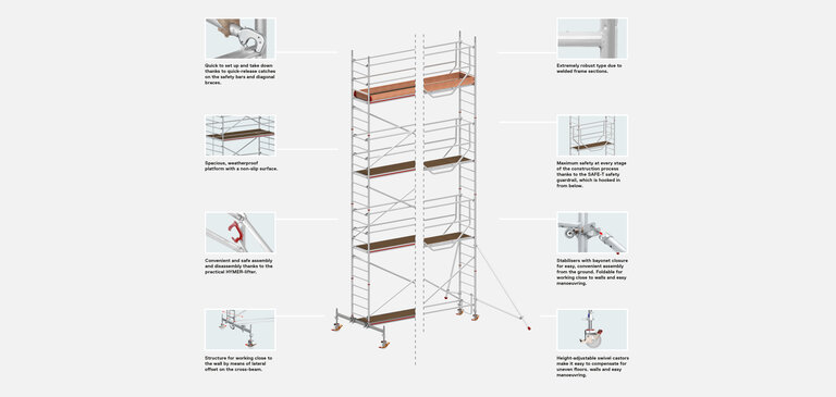 One thing is clear: mobile towers must first and foremost secure the people who do hard work at height every day. And to ensure that no valuable time is lost during assembly and dismantling, mobile towers should also be ready for use quickly and, above all, in just a few simple steps.